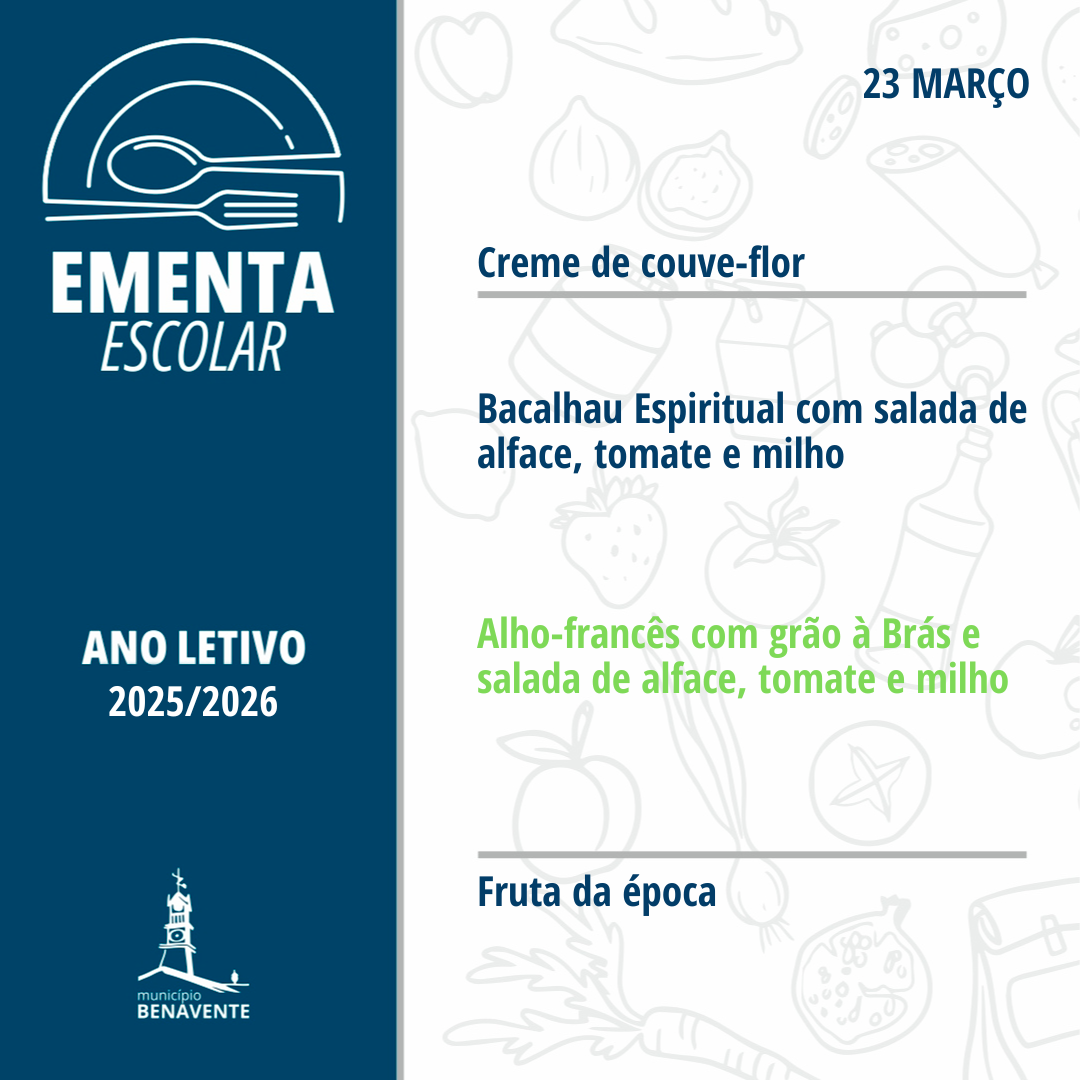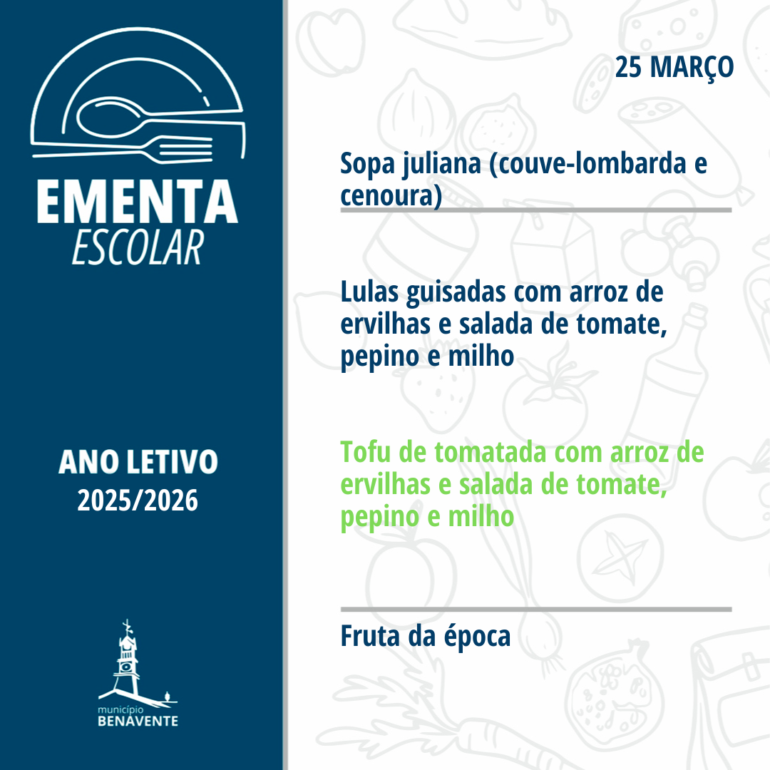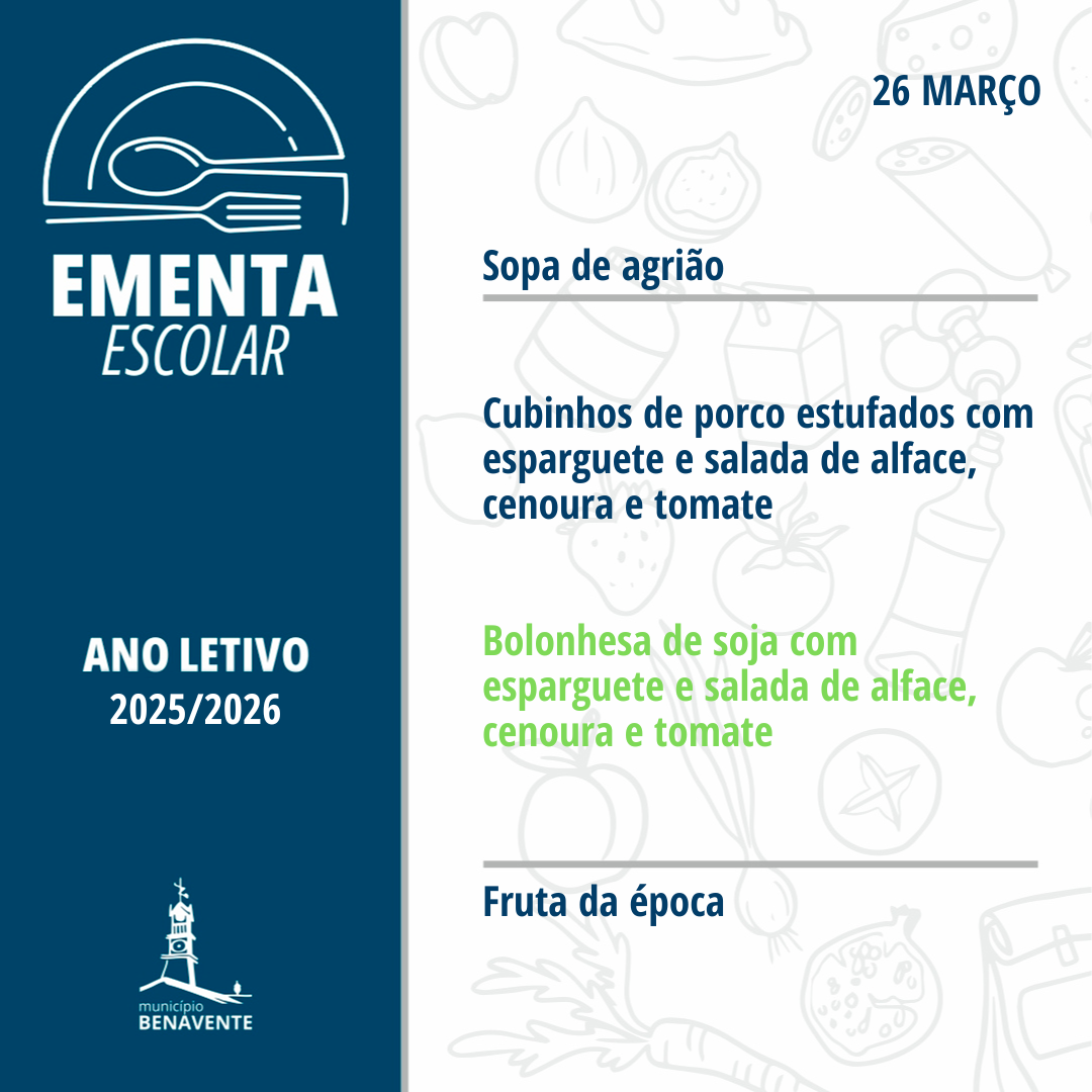 O Município de Benavente considerando a importância do lanche escolar, garante o fornecimento a todos os alunos da educação pré-escolar e 1.º ciclo posicionados em escalão A.
